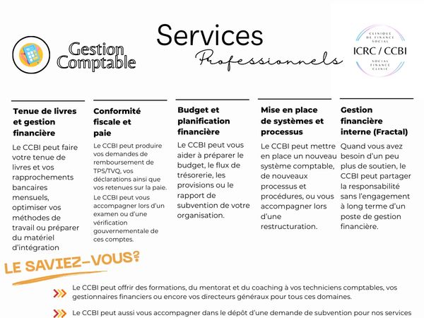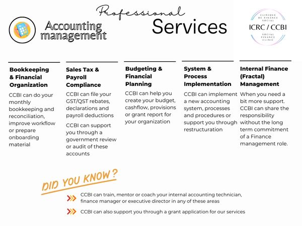 Our accounting management services are available to the public 12 months a year to assist with your accounting, reconciliation, government reporting, system implementation or accompany you, your non-profit or small business through restructuration, review or audit !